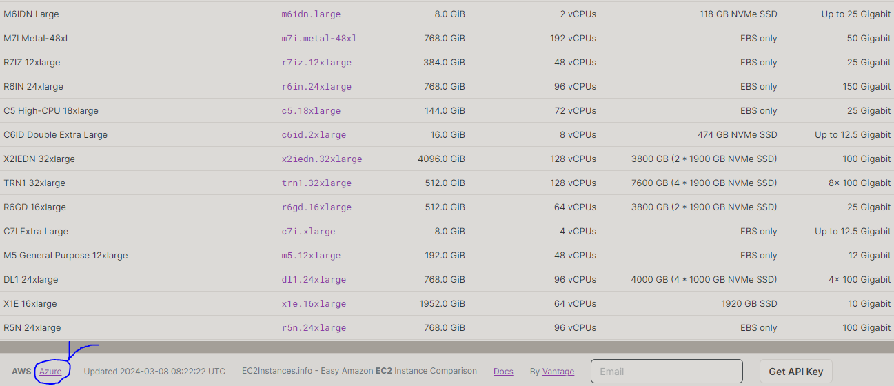 - 사이트에서는 AWS뿐만아니라 좌측하단 Azure버튼을 통해 MS AZURE의 가상머신의 종류 또한 확인할 수 있으니 참고하시기 바랍니다.
