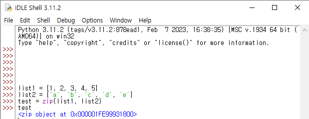 [(1, 'a'), (2, 'b'), (3, 'c'), (4, 'd'), (5, 'e')] #실행 결과